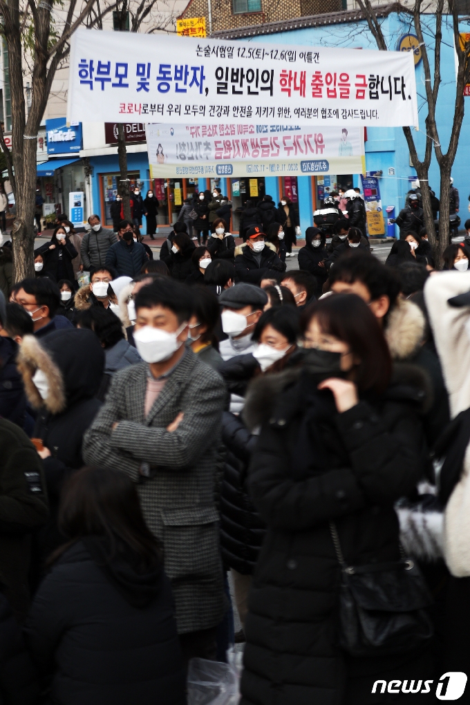 (서울=뉴스1) 황기선 기자 = '2021학년도 수시모집 논술고사'가 실시된 5일 오후 서울 종로구 성균관대학교에서 학부모들이 수험생을 기다리고 있다. 2020.12.5/뉴스1