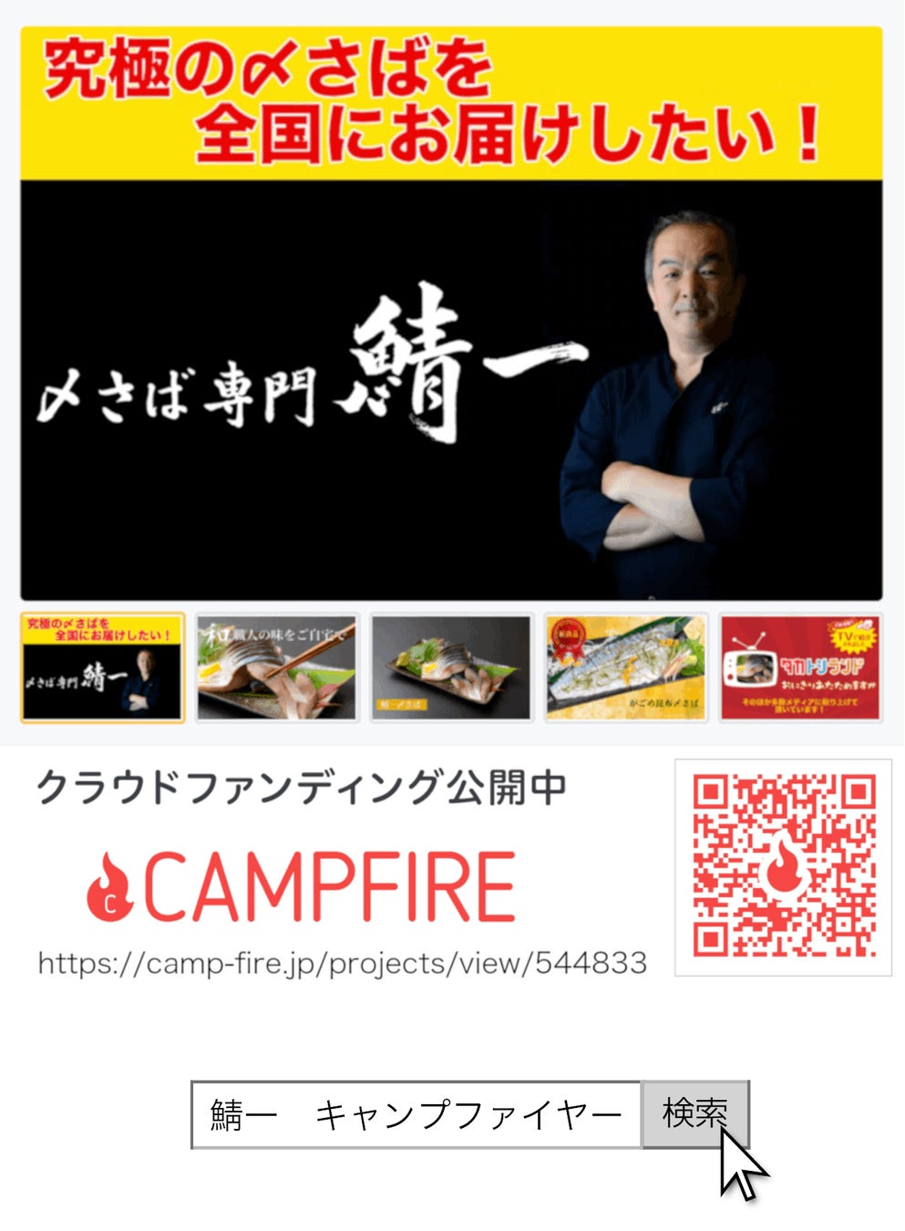 CAMPFIRE(キャンプファイヤー)サイト内の検索から『鯖一』を入力頂くか、下記URLからご支援頂ければ幸いです。